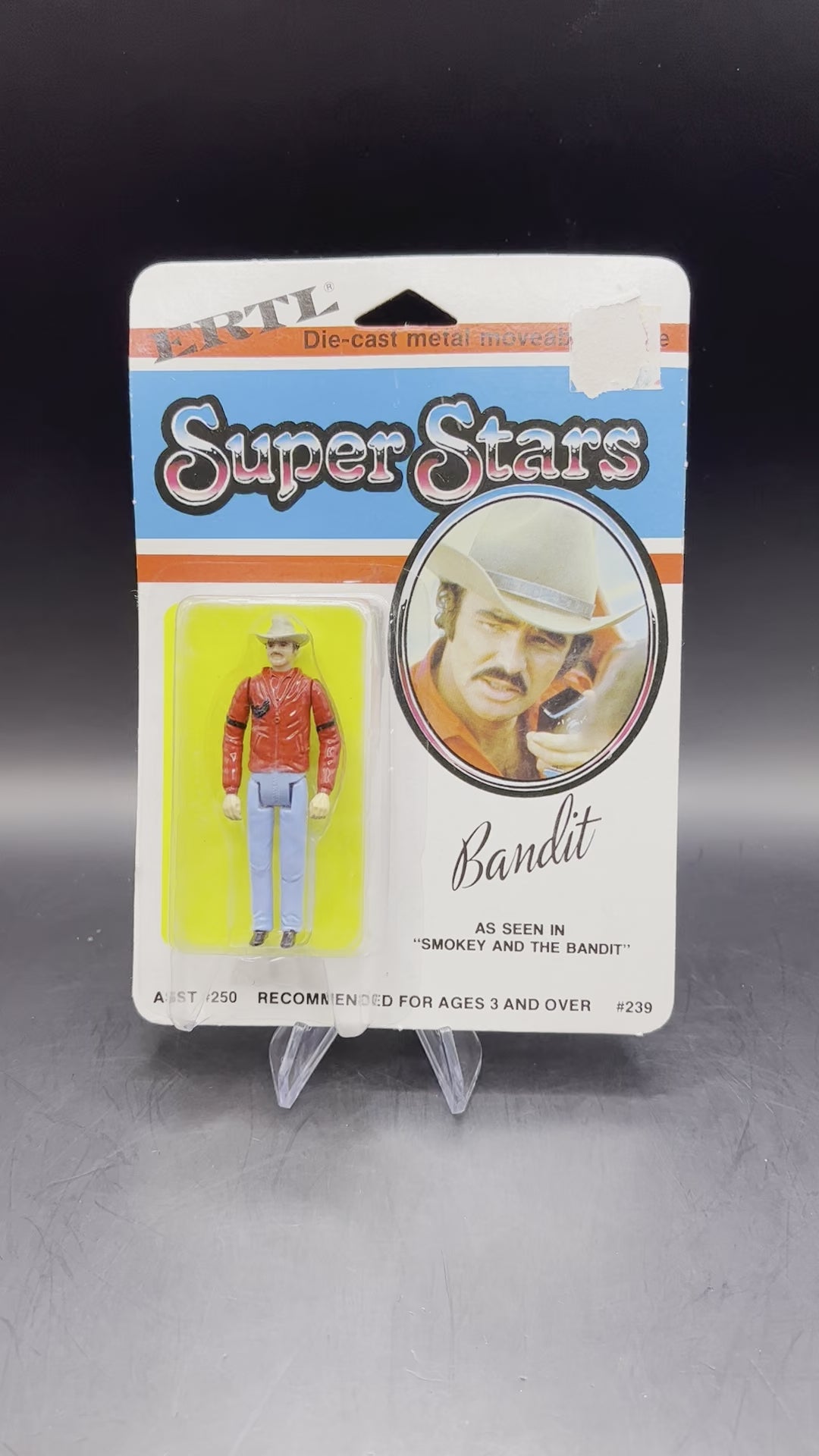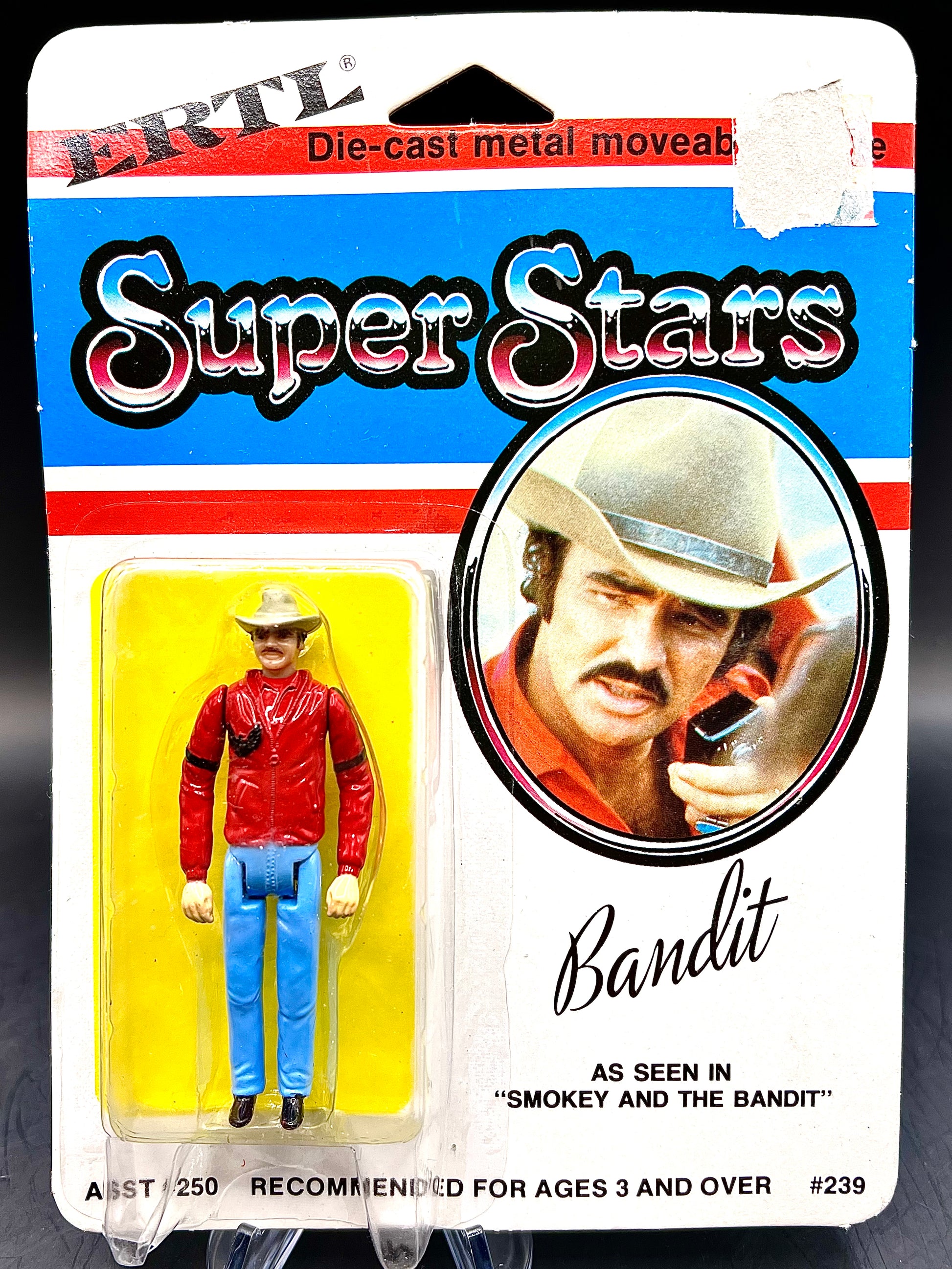 Here is a 1982 ERTL Super Star SMOKEY and the BANDIT Burt Reynolds die-cast action figure new old stock, unopened still in package. Figure is 3" tall. Plastic cover is just a bit kinked in one corner and card board is torn off from removal of price tag.