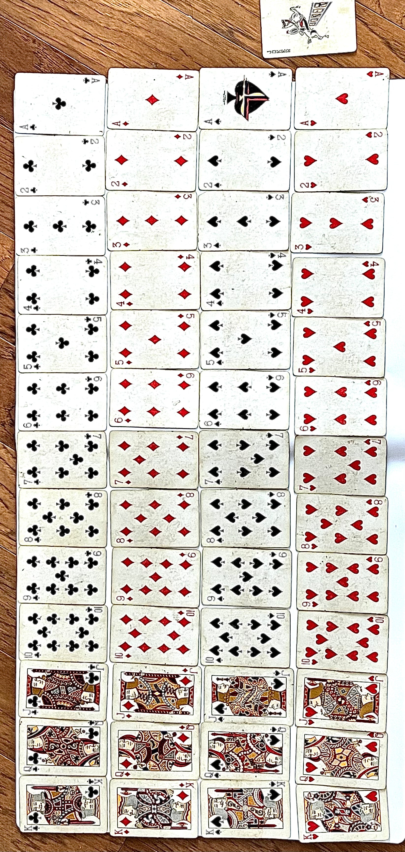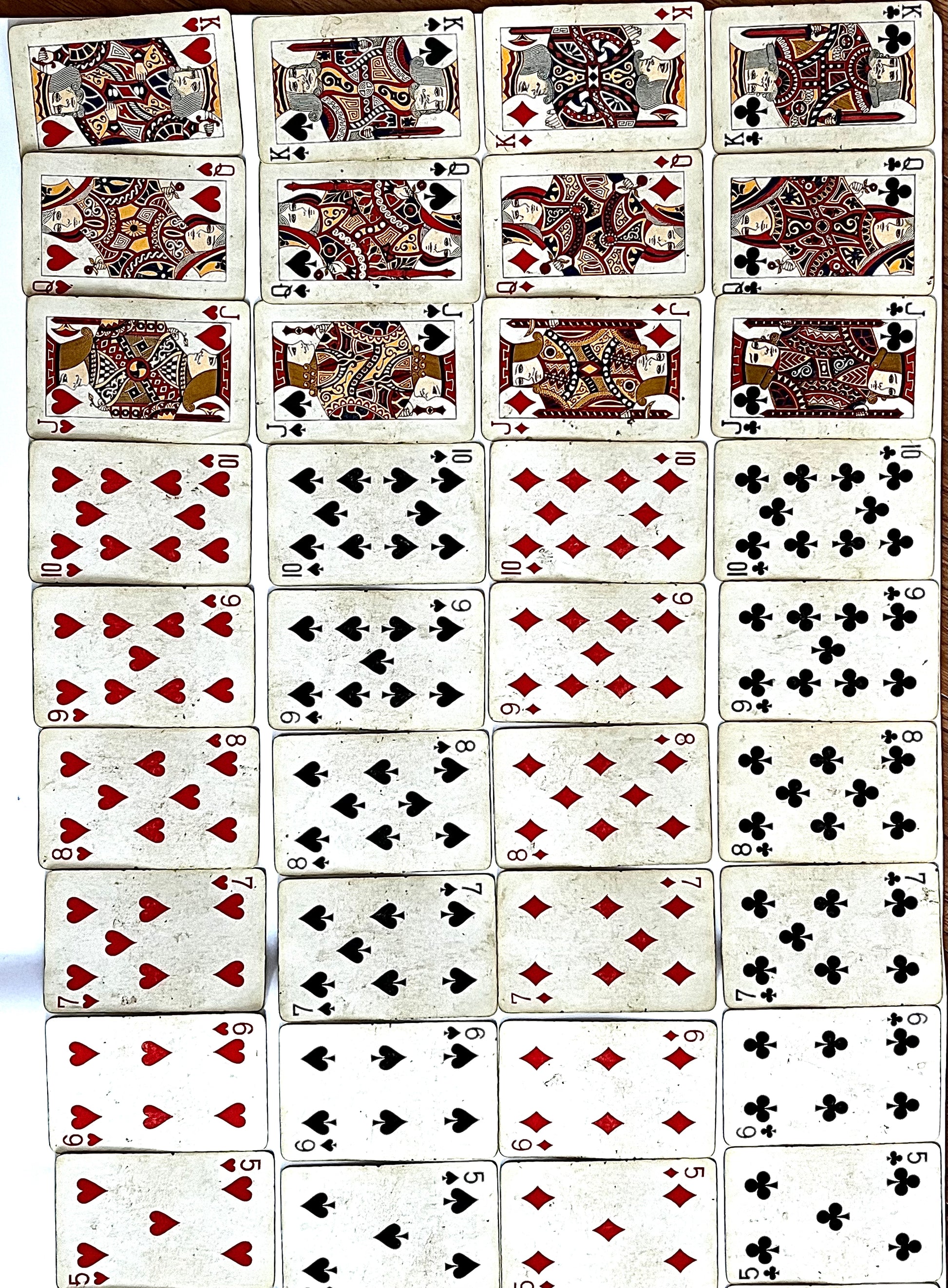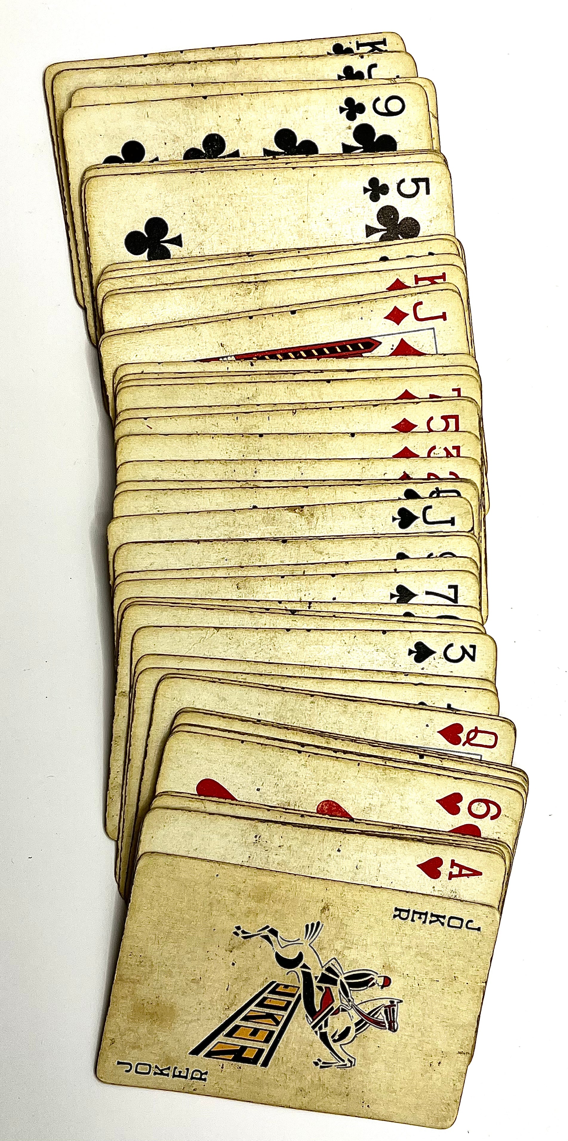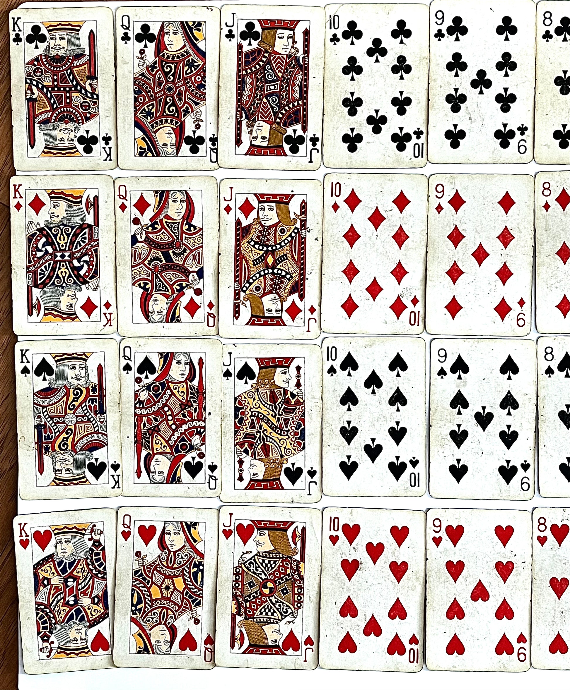 Manufactured by Brown & Bigelow in the USA and once again, the evidence suggests to me that production began in 1939 at the earliest. This deck also says “Drink Coca-Cola in Bottles” in italics. This is a Hund & Eger deck. Cards with damage have individual Pictures.