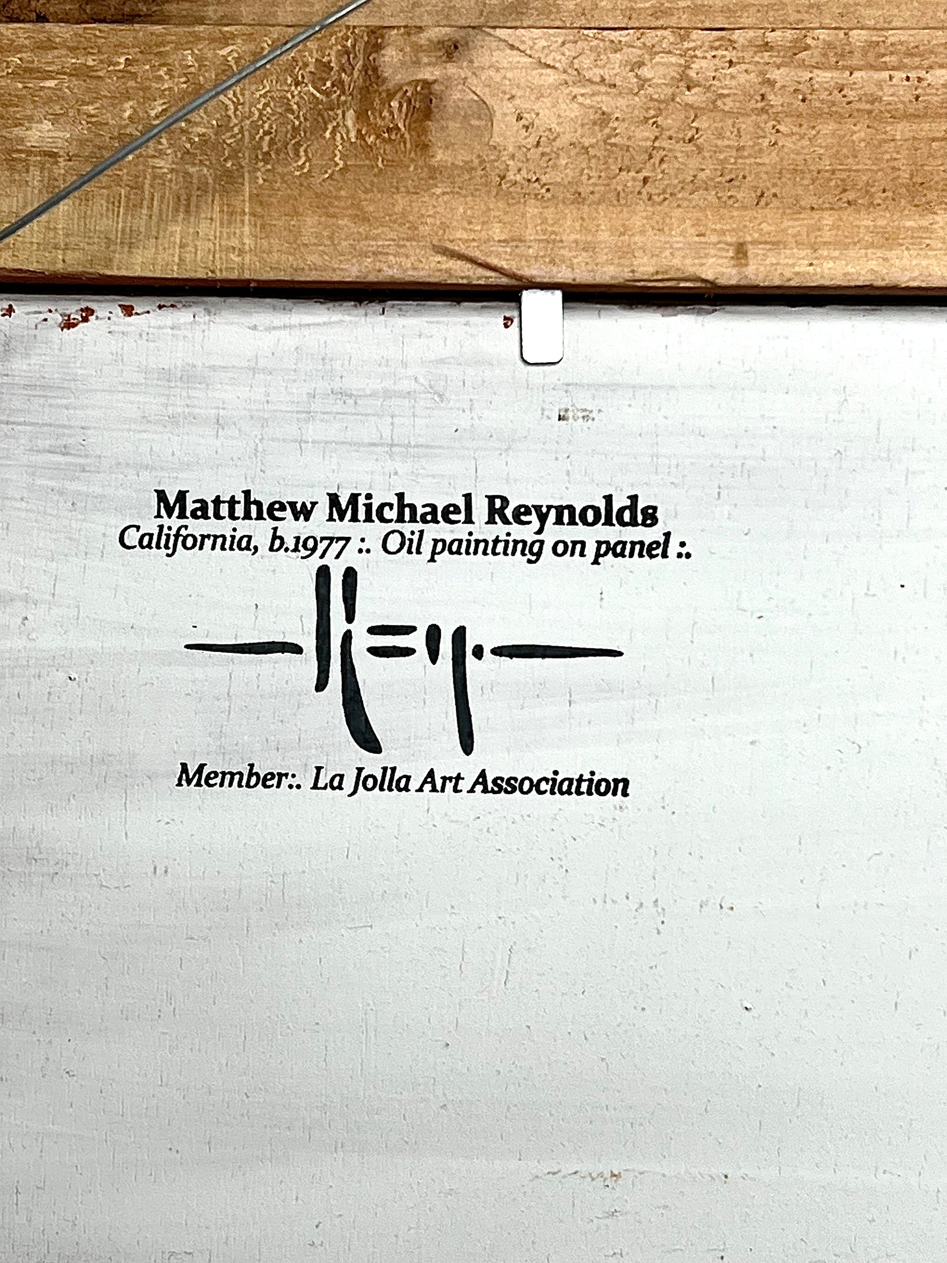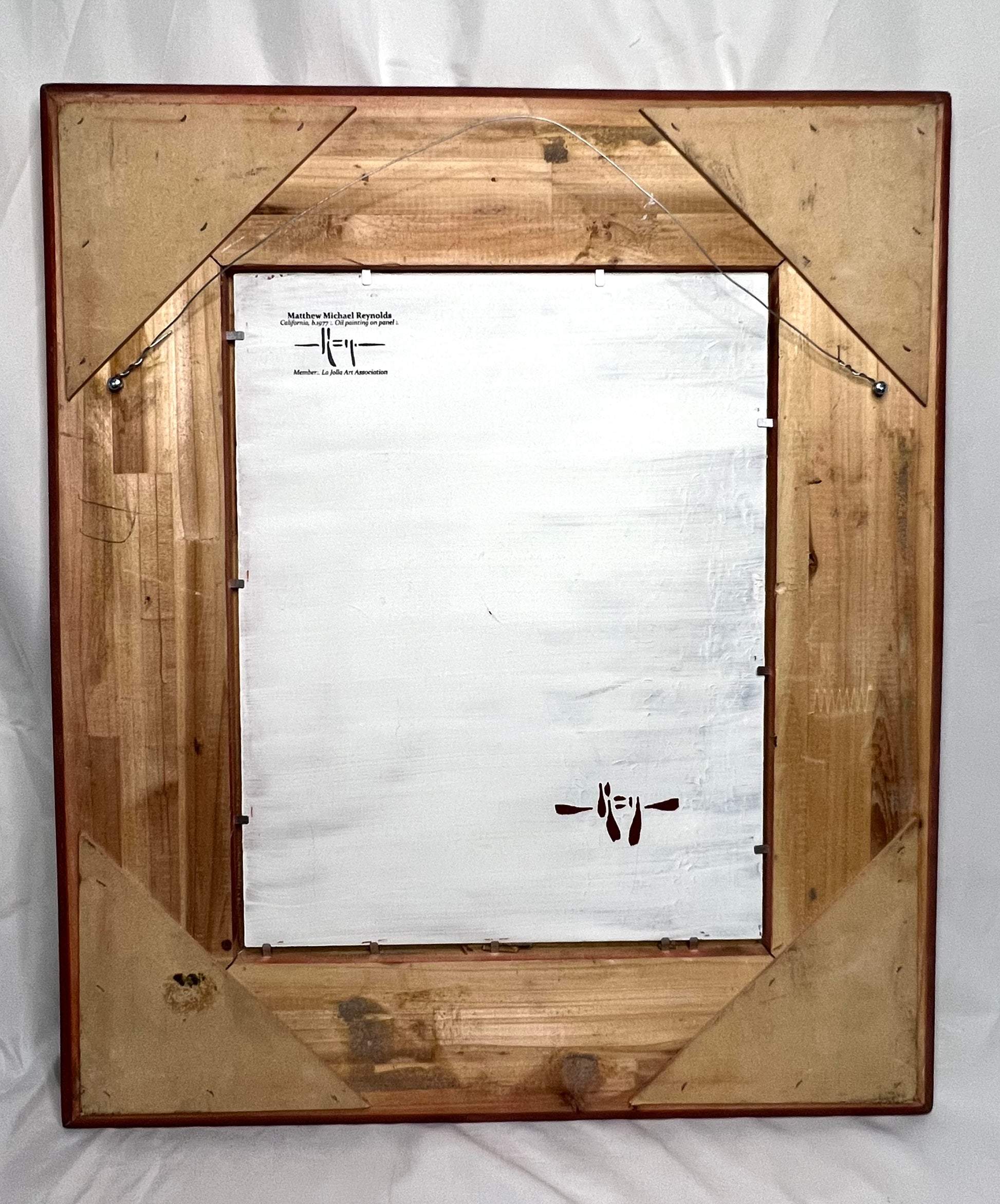 Original contemporary oil painting on panel by listed California artist, Matthew Michael Reynolds (b.1977). Stamped verso. Signed as shown. Nice heavy gilt Summit frame.
